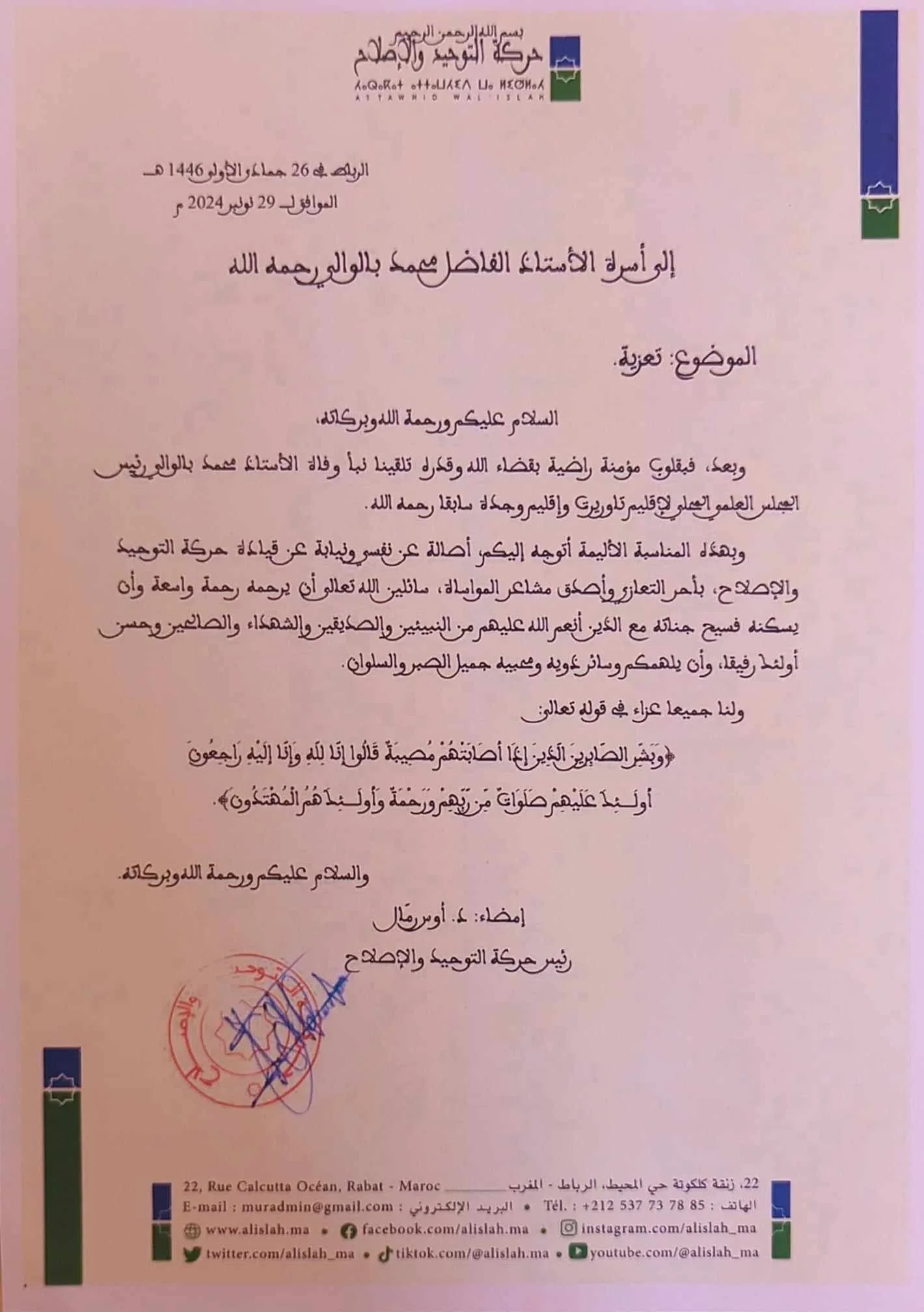 إننا بهذه المناسبة الأليمة، أتوجه أصالة عن نفسي وبصفتي رئيس حركة التوحيد والإصلاح، وبالنيابة عن جميع أعضاء الحركة، بأحر التعازي وأصدق مشاعر المواساة، طالبين الله تعالى أن يتغمد الفقيد بواسع رحمته مع الذين أنعم الله عليهم من النبيئين والصديقين والشهداء والصالحين، وحسن أولئك رفيقاً، وأن يلهمكم وذويه جميل الصبر والسلوان