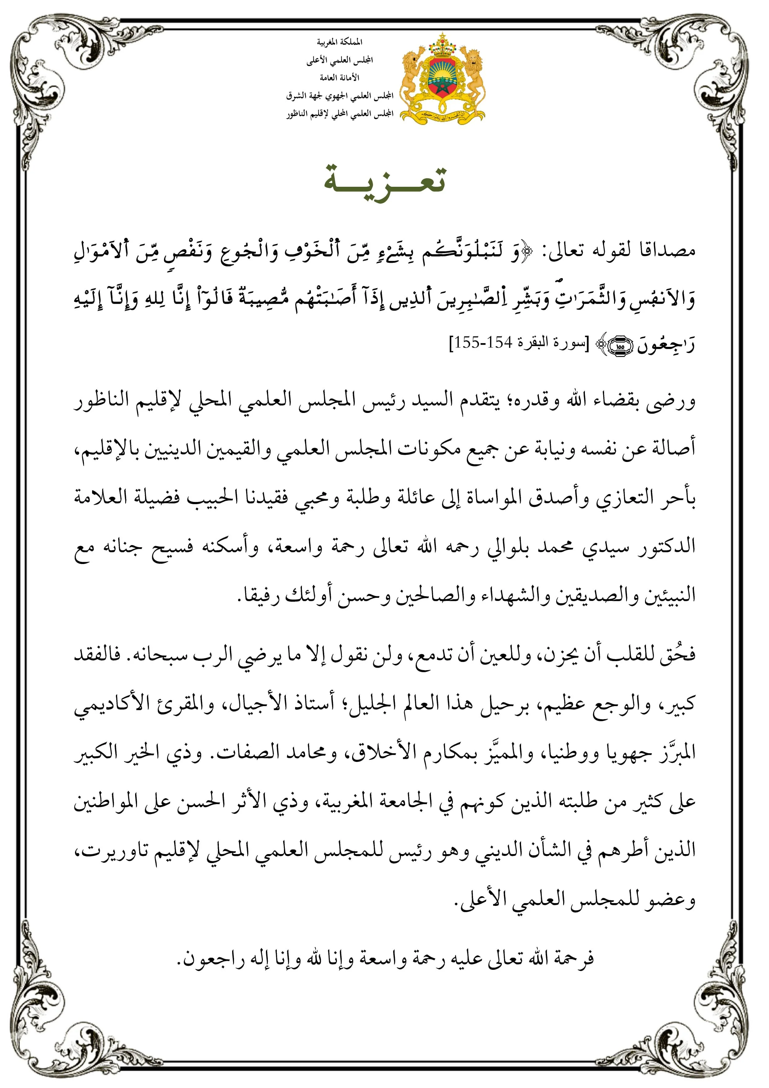 ورضى بقضاء الله وقدره، يتقدم السيد رئيس المجلس العلمي المحلي لإقليم الناظور أصالة عن نفسه ونيابة عن جميع مكونات المجلس العلمي والقيمين الدينيين بالإقليم، بأحر التعازي وأصدق المواساة إلى عائلة وطلبة ومحبي فقيدنا الحبيب فضيلة العلامة الدكتور سيدي محمد بلولي، رحمه الله تعالى رحمة واسعة، وأسكنه فسيح جناته مع النبيين والصديقين والشهداء والصالحين وحسن أولئك رفيقاً.